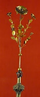 “Dios, por cuya palabra y poder se hicieron todas las cosas y por cuya voluntad se rigen los Universos; que eres la alegría y gozo de todos los fieles, humildemente rogamos a Tu Majestad que por tu misericordia te dignes bendecir y santificar esta rosa gratísima de aroma y de vista, que hoy en signo de espiritual alegría llevamos en nuestras manos, a fin de que el pueblo que te pertenece, sacado del yugo de la cautividad de Babilonia por la gracia de tu Hijo unigénito que es gloria y regocijo de la plebe de Israel, anticipe a los corazones sinceros el gozo de aquella Jerusalén de lo alto que es nuestra Madre. Y pues en honor de tu nombre tu Iglesia se alegra y regocija hoy con este signo, dígnate, Señor, darle verdadero y perfecto gozo, y así, aceptando su devoción, perdones los pecados, llenes con la fe, ayudes con la indulgencia, protejas con la misericordia, destruyas las adversidades, y concedas todo género de prosperidad, hasta que por fruto de la buena obra, en olor de los aromas de aquella flor que procede de la raíz de Jesé, y que a sí misma se llama flor del campo y lirio de los valles, con ella en la eterna gloria con todos los Santos se regocije sin fin. Por Nuestro Señor Jesucristo, que contigo vive y reina en unidad del Espíritu Santo, Dios, por todos los siglos de los siglos. Amén”. «Para su bendición, que se hace junto a la mesa del vestuario donde nuestro Santísimo Padre recibe sus ornamentos, se prepara un pequeño altar y se ponen sobre él dos candelabros; el Pontífice, vestido de amito, alba, cíngulo, estola, capa pluvial y mitra, dice: «Terminada la oración, unta con bálsamo la Rosa de oro que está en el mismo ramillete, y le echa almizcle molido que se le ministra por el Sacristán, y pone el incienso en el turíbulo según la rúbrica, y rocía la rosa con agua bendita, y quema el incienso. En tanto un Clérigo de la Cámara Apostólica tiene la Rosa en su mano, que pasa al punto a las del Diácono Cardenal, y éste la entrega al Pontífice, quien, tomándola y llevándola en la mano izquierda, se pone en marcha hacia la capilla, bendiciendo con la derecha; y los Diáconos Cardenales elevan la capa pluvial: al llegar al faldistorio da la Rosa al dicho Diácono, quien a su vez la entrega al Clérigo de la Cámara, y éste la pone sobre el altar. Acabada la Misa, y hecha oración ante el altar por el Pontífice, recibe la Rosa como antes y la lleva a su Cámara. Si aquel a quien quiere darla está presente, se le hace llegar a sus pies; y estando de rodillas le da el Pontífice la Rosa diciendo: “Recibe la Rosa de nuestras manos, que aunque sin méritos, tenemos en la tierra el lugar de Dios. Por ella se designa el gozo de una y otra Jerusalén; es a saber, de la Iglesia triunfante y militante, por la cual a todos los fieles de Cristo se manifiesta aquella flor hermosísima que es gozo y corona de todos los Santos. Recibe ésta tú, hijo amadísimo, que eres noble según el siglo, poderoso y dotado de gran valor, para que más y más te ennoblezcas en Cristo Nuestro Señor con todo género de virtudes, como rosas plantadas junto al río de aguas abundantes, cuya gracia, por un acto de su infinita clemencia, se digne concederte el que es Trino y Uno por lo siglos de los siglos. Amén. En el nombre del Padre, y del Hijo, y del Espíritu Santo”. «Alguna vez se ha hecho esta ceremonia en la capilla terminada la Misa, antes de que el Papa bajara de su silla; pero es más conveniente que el Papa vuelva a la Cámara con la Rosa, y así lo encuentro practicado por nuestros mayores. Aquel a quien se da la Rosa, después que ha besado la mano y el pie del Pontífice y dádole gracias, y una vez que el Papa de ha desnudado ya en la Cámara de sus sagradas vestiduras, es acompañado, llevando es su mano la Rosa, hasta la casa de su habitación, por el Colegio de Cardenales, en medio de los dos más antiguos, seguidos de todos los otros, y rodeándole a pie los servidores de la Curia Romana con sus varas, que suelen en aquel día recibir gajes de parte del favorecido con la Rosa». Cuando el beneficiario de la Rosa de Oro no se hallaba en la Corte Pontificia el Papa se la enviaba por medio de un embajador. Desde León X se encargaba de la consigna un ablegado (el mismo que llevaba el birrete a algún cardenal residente fuera de Roma), camarero secreto o protonotario apostólico. En contra de la creencia generalizada, la Rosa de Oro no se concede sólo a soberanas o princesas católicas, aunque así haya sido en muchas ocasiones y casi invariablemente desde el siglo XVI. También han sido gratificados ilustres varones de la Cristiandad por méritos contraídos en la defensa de la Fe Católica y de los derechos de la Iglesia. Y no sólo se concede a personas, sino, como queda dicho al inicio, a santuarios e imágenes insignes. El enviado papal portador de la Rosa de Oro era recibido con gran ceremonia a su llegada al lugar donde se encontraba el agraciado con ella. En España era un Grande el que, comisionado por el Rey, se adelantaba al enviado pontificio para recoger la distinción y llevarla a la iglesia donde se debía verificar su recepción solemne. En el día indicado, el propio representante papal, si tenía el orden episcopal, celebraba misa pontifical. Antes de dar la bendición final, se sentaba en medio del altar, estando frente a él la persona regia destinataria de la Rosa de Oro. El notario real debía entonces leer la bula papal de concesión y las indulgencias otorgadas en la ocasión, acabado lo cual se levantaba el prelado y tomaba aquélla en sus manos para entregarla a dicha persona –que la recibía de rodillas– con estas palabras: “Accipe Rosam de manibus nostris quam de speciale commissione Sanctissimi Domini Nostri NN (nombre del Papa) conferimus tibi”. Dada la bendición, la Rosa de Oro era llevada con gran acompañamiento por la persona distinguida por ella o por su capellán al oratorio donde se iba a colocar perm